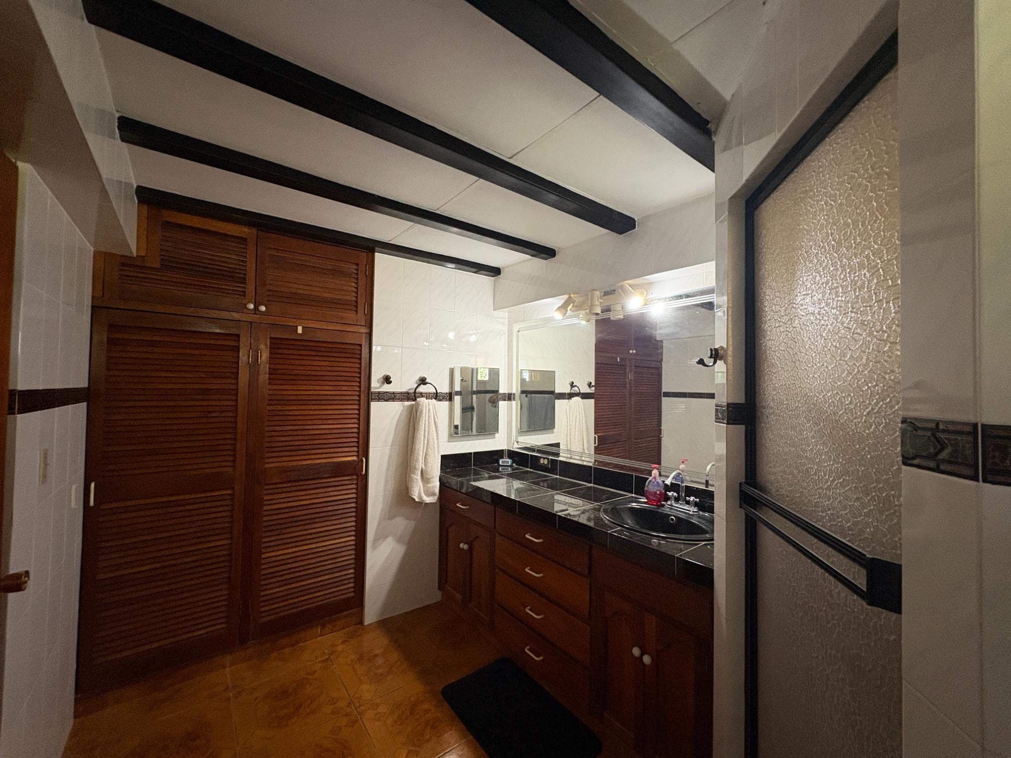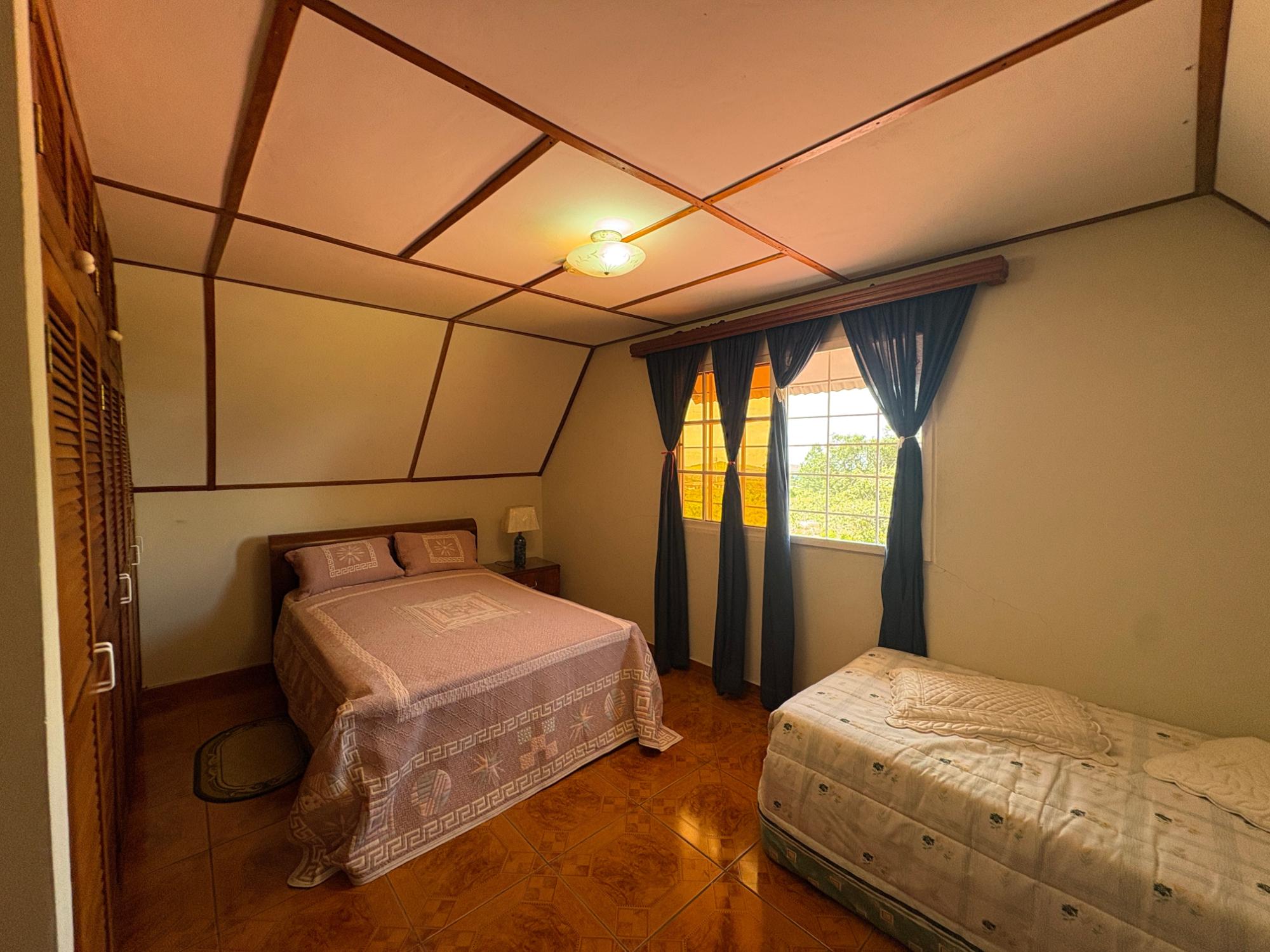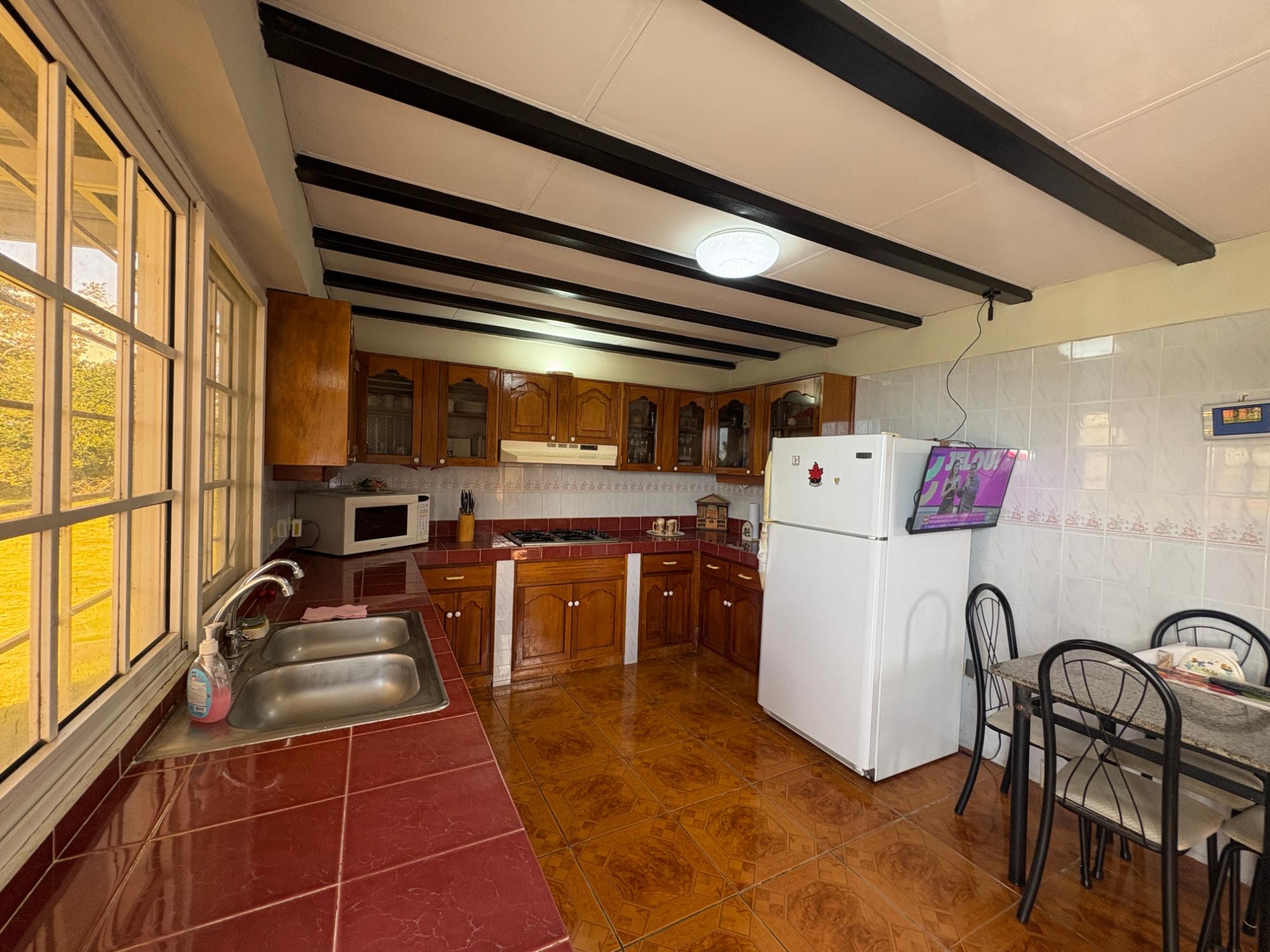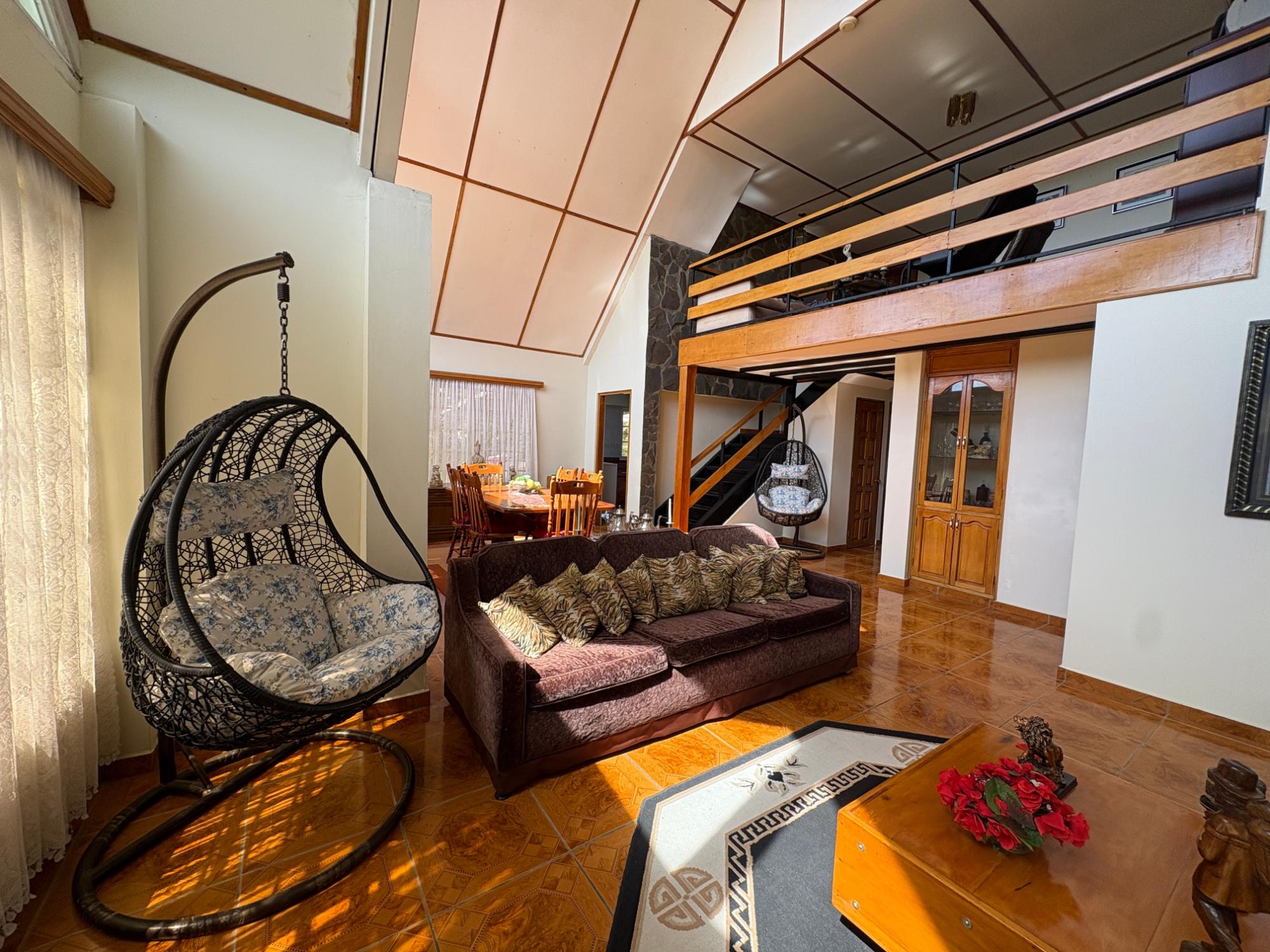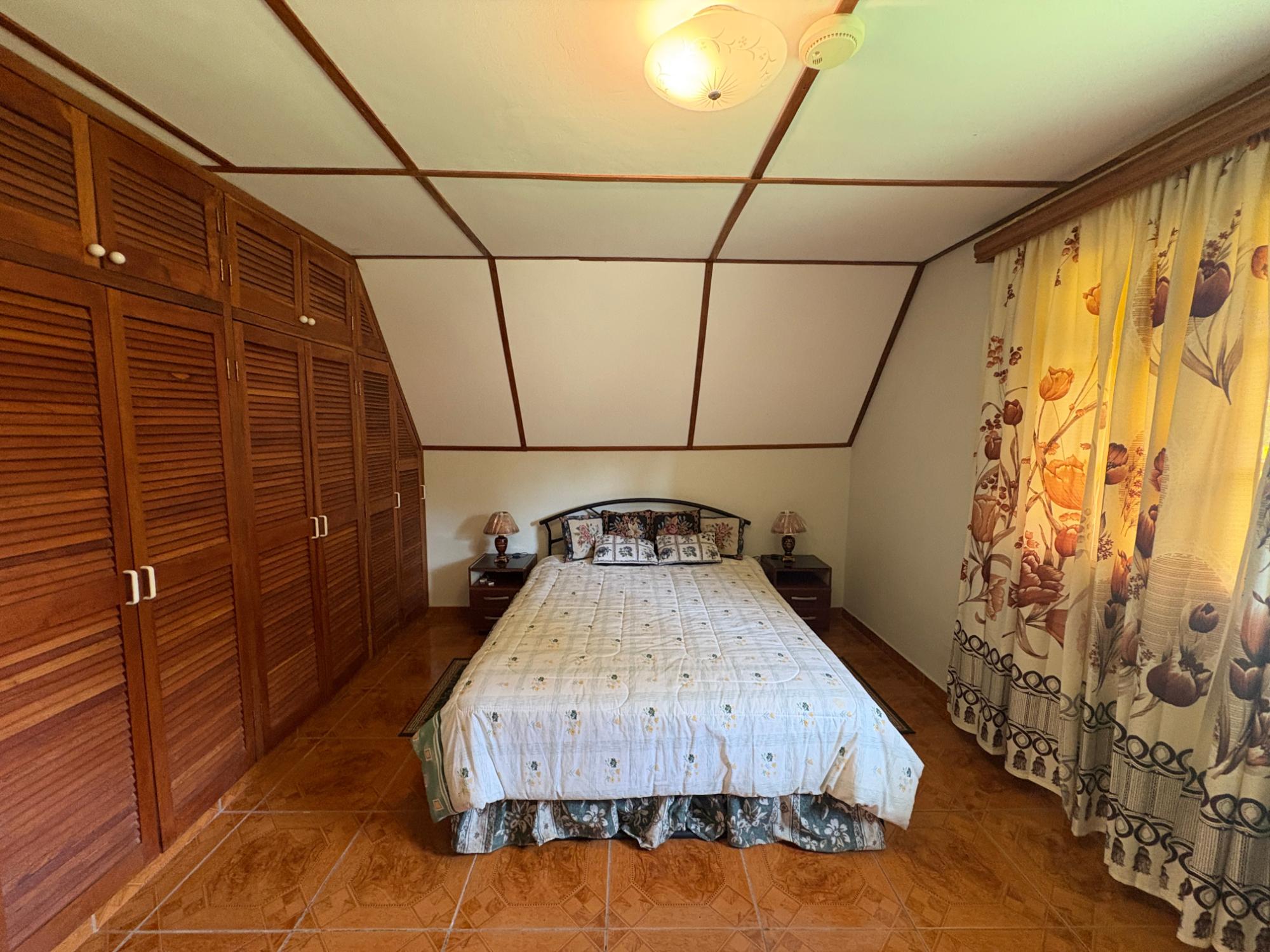 Esta propiedad en Alto Dorado, Alto Boquete, se encuentra en un terreno plano de 4,115 m² y está completamente cercada. Ubicada a solo 12 minutos del centro de Boquete, la casa ofrece privacidad, espacio y un entorno pintoresco con vistas a las montañas. Construcción sólida e interior luminoso. La casa principal cuenta con 3 dormitorios y 3 baños. La casa presenta una distribución espaciosa con altos techos abovedados en la sala de estar, gracias a su diseño de techo a dos aguas, que realza la sensación de espacio y luz. Grandes ventanales ofrecen vistas a las montañas y crean un ambiente tranquilo en toda la casa. Las áreas abiertas de sala de estar y comedor añaden calidez y carácter al espacio. Cocina e inclusiones: La cocina es espaciosa, con gabinetes de madera y encimeras de azulejos rojos. La propiedad se vende con electrodomésticos principales, que incluyen refrigerador, estufa y lavadora. Terraza cubierta y disfrute al aire libre: Una terraza cubierta ofrece un espacio cómodo para disfrutar del clima de Boquete. Este espacio es ideal para comidas informales o para pasar tiempo al aire libre con vistas a los jardines, árboles y patio de la propiedad. Terreno productivo con árboles frutales y arroyo estacional. El lote incluye una variedad de árboles frutales, como anacardos (marañón curazao), durazneros y perales jóvenes, y un arroyo estacional que atraviesa la parte trasera de la propiedad. El terreno está bien mantenido, es abierto y apto para jardinería, plantaciones adicionales o incluso para futuras construcciones. Estacionamiento y acceso: Hay una cochera cubierta con espacio para dos vehículos y una amplia entrada. La casa se encuentra en una calle tranquila dentro de una zona residencial de Alto Dorado, con fácil acceso a la carretera principal que lleva al pueblo.