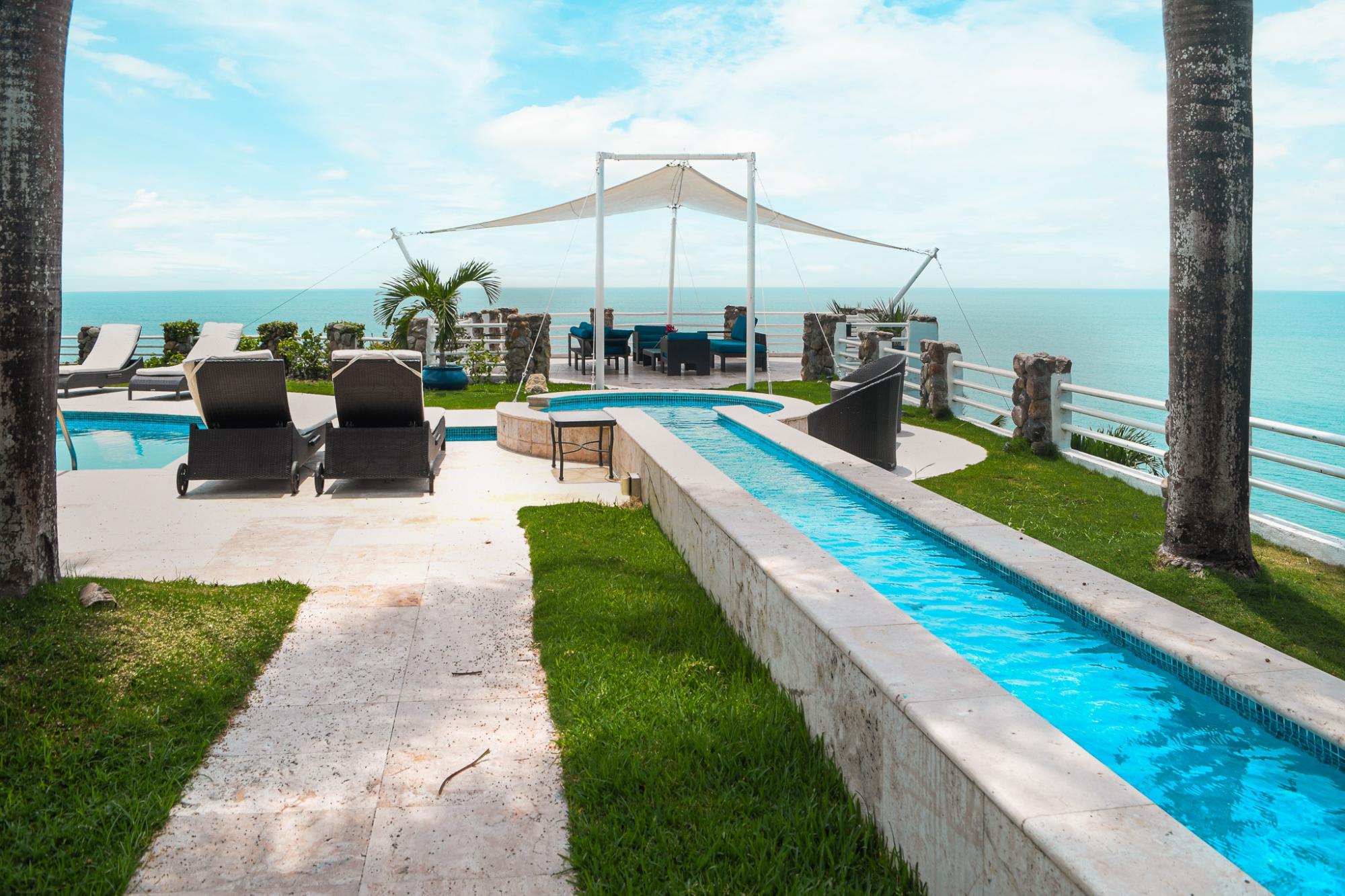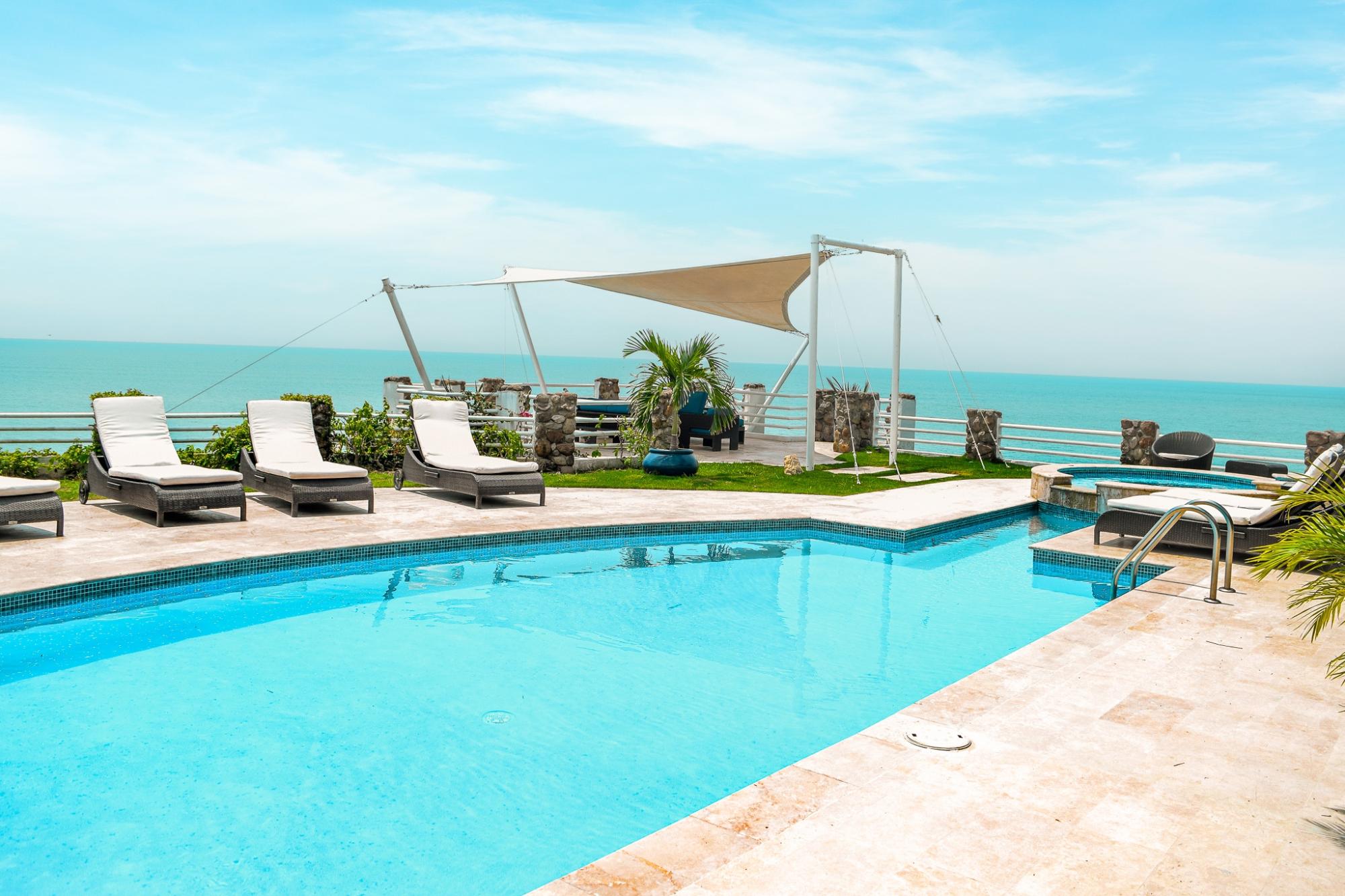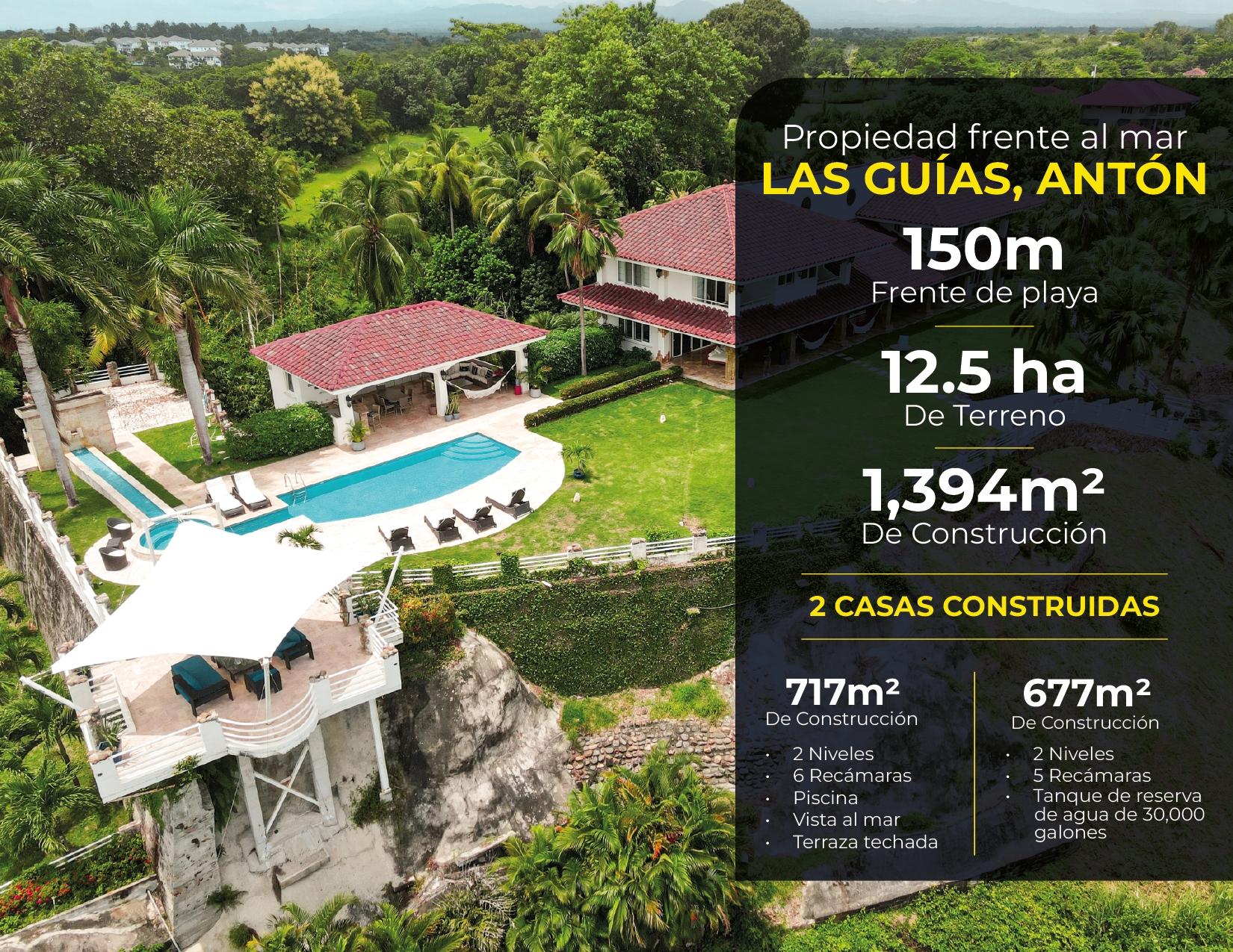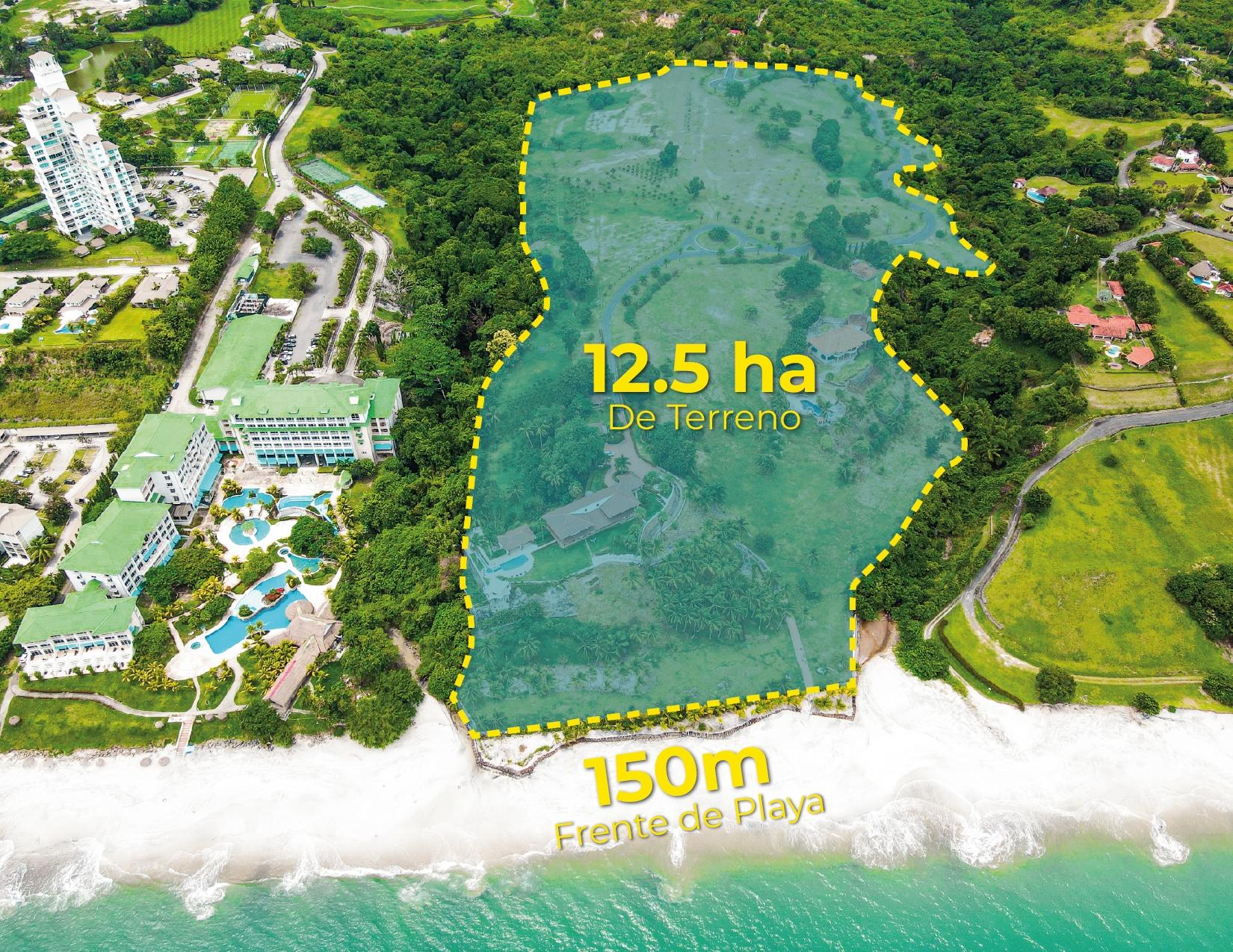 Propiedad ideal para Desarrollo de Hotel o Urb. Residencial Privada de Playa frente a las playas del Pacífico. Es un globo de terreno de 12.5 Hectáreas con 150m frente al mar. Tiene una garita de acceso, carretera interna de grava, con toda la electricidad y drenajes soterrados, grandes áreas verdes bien mantenidas y de uso privado. Cuenta con 2 casas construidas, una de 717m2 de Construcción de 2 niveles con 6 recámaras, amplia piscina con vista al mar y una terraza techada con vista 360 al mar y la propiedad. Adicional tiene otra casa de 677m2 de construcción con 5 recámaras. Tanque de Reserva de agua de 30,000 galones.