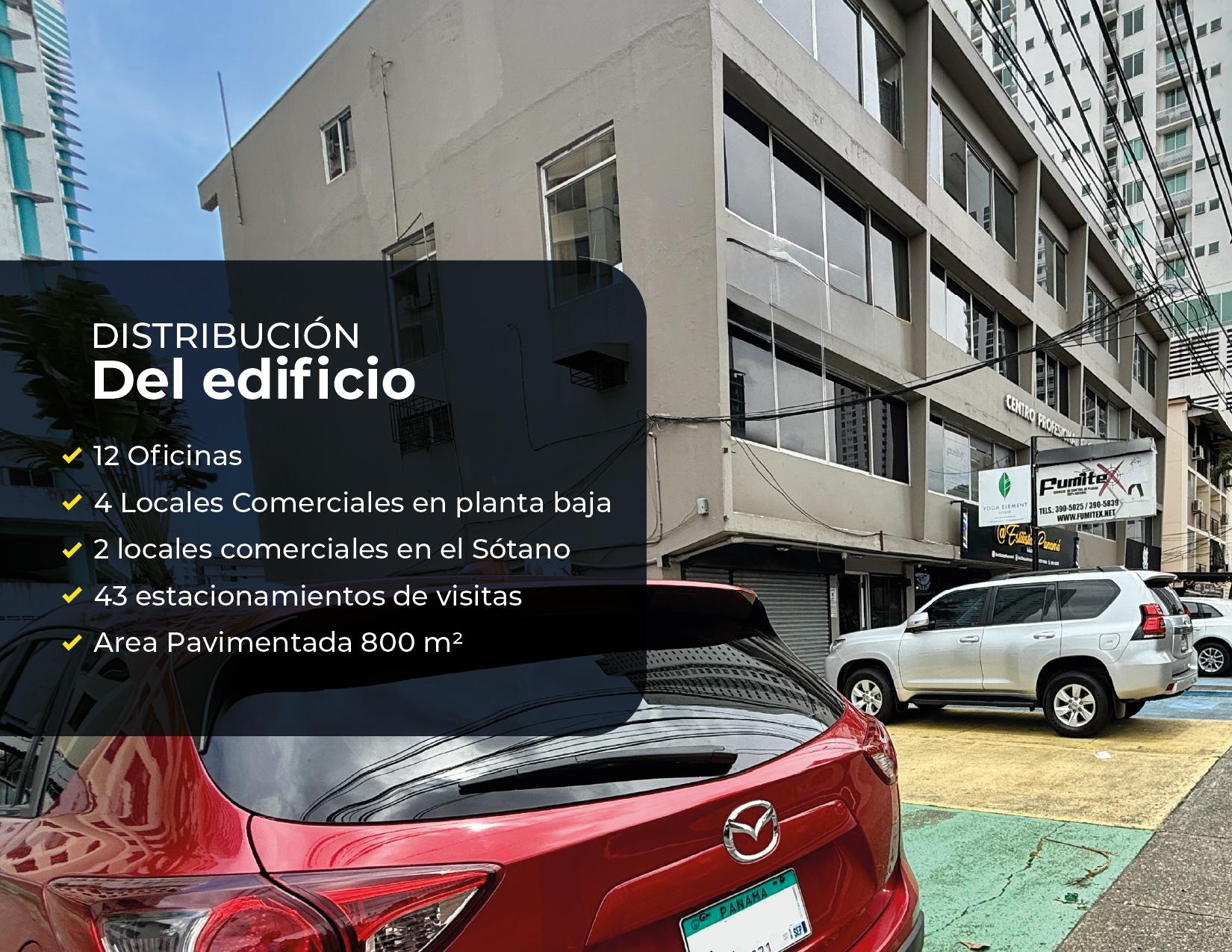 La propiedad ofrece una excelente visibilidad ya que esta ubicada justo detrás de la casa de las baterías de Vía Porras y a solo 25 metros del Parque Omar, cerca de bancos, restaurantes, y otros comercios Fácil acceso desde Vía Porras y Calle 50 El edificio cuenta con: 12 Oficinas 4 Locales Comerciales en planta baja 2 locales comerciales en el Sótano 42 estacionamientos de visitas Área Pavimentada 800 m2
